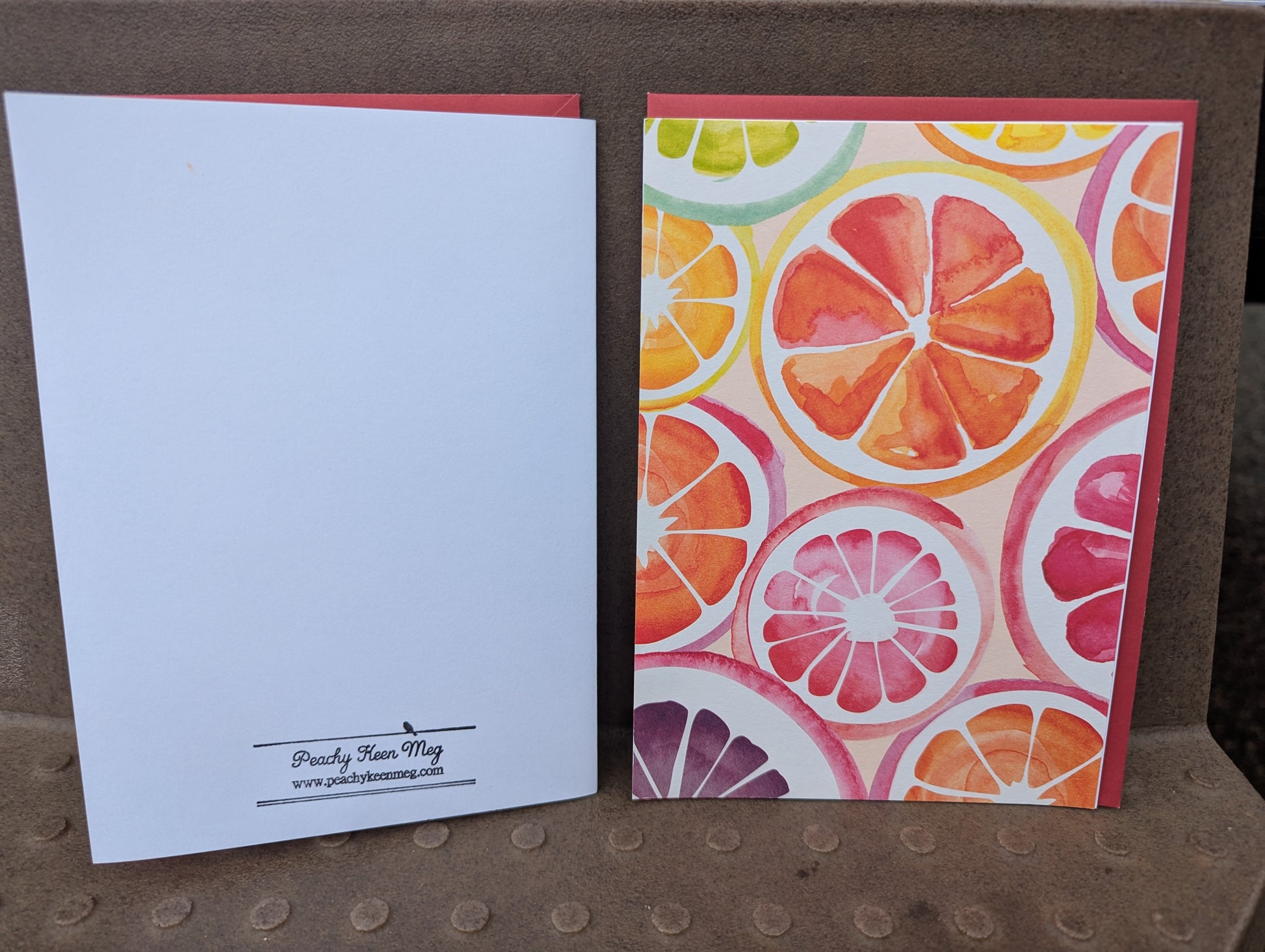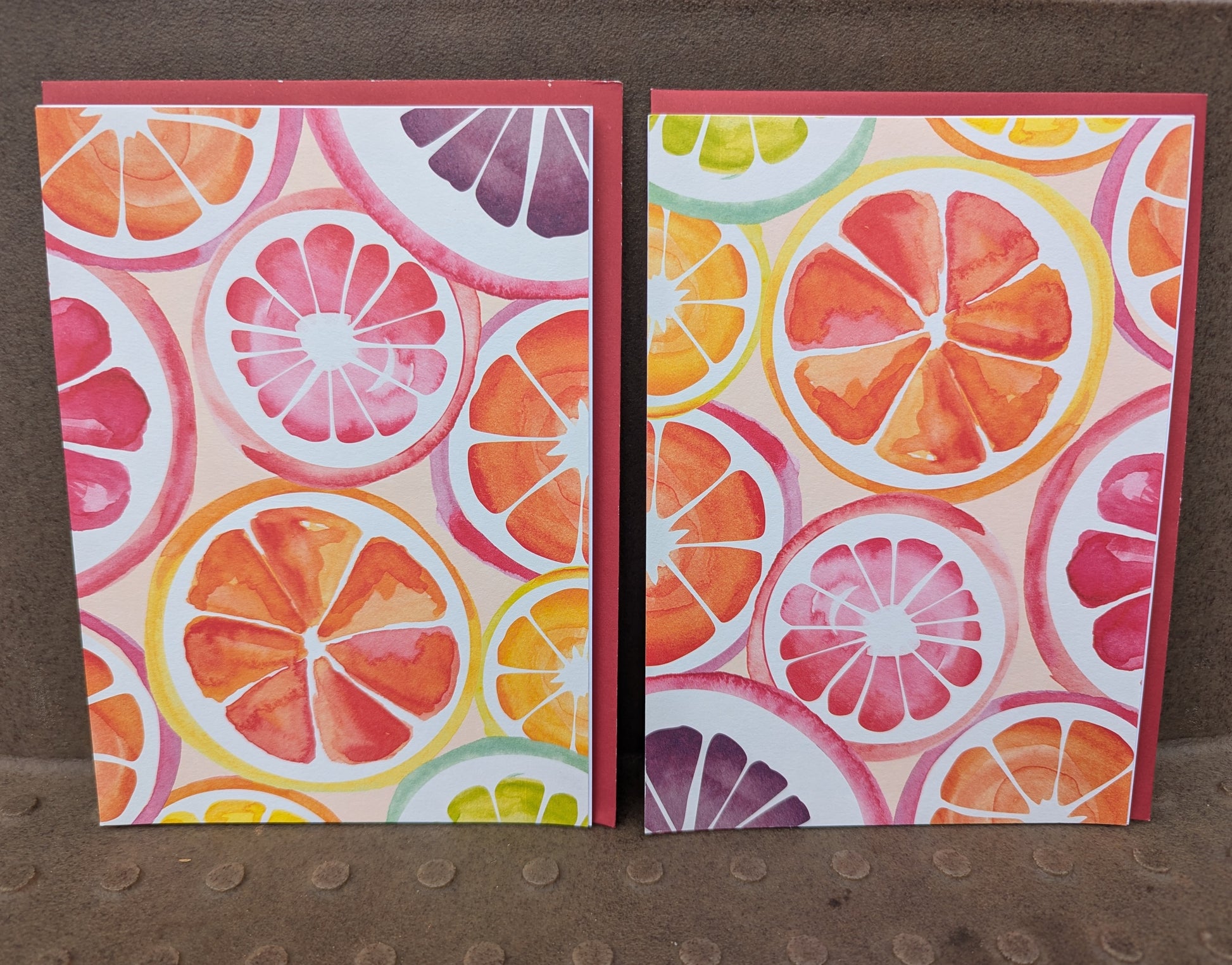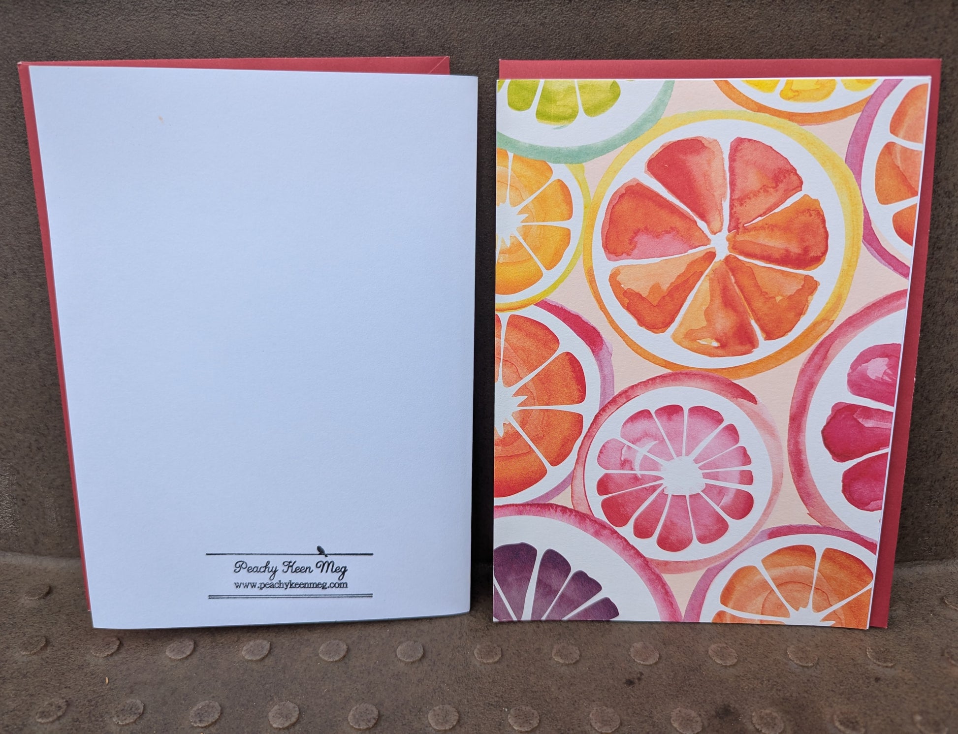 This high quality stationary made with reclaimed and rescued supplies features bright watercolor citrus, perfect for a summer note! Mounted on a white folded cards, includes a distressed red envelope.