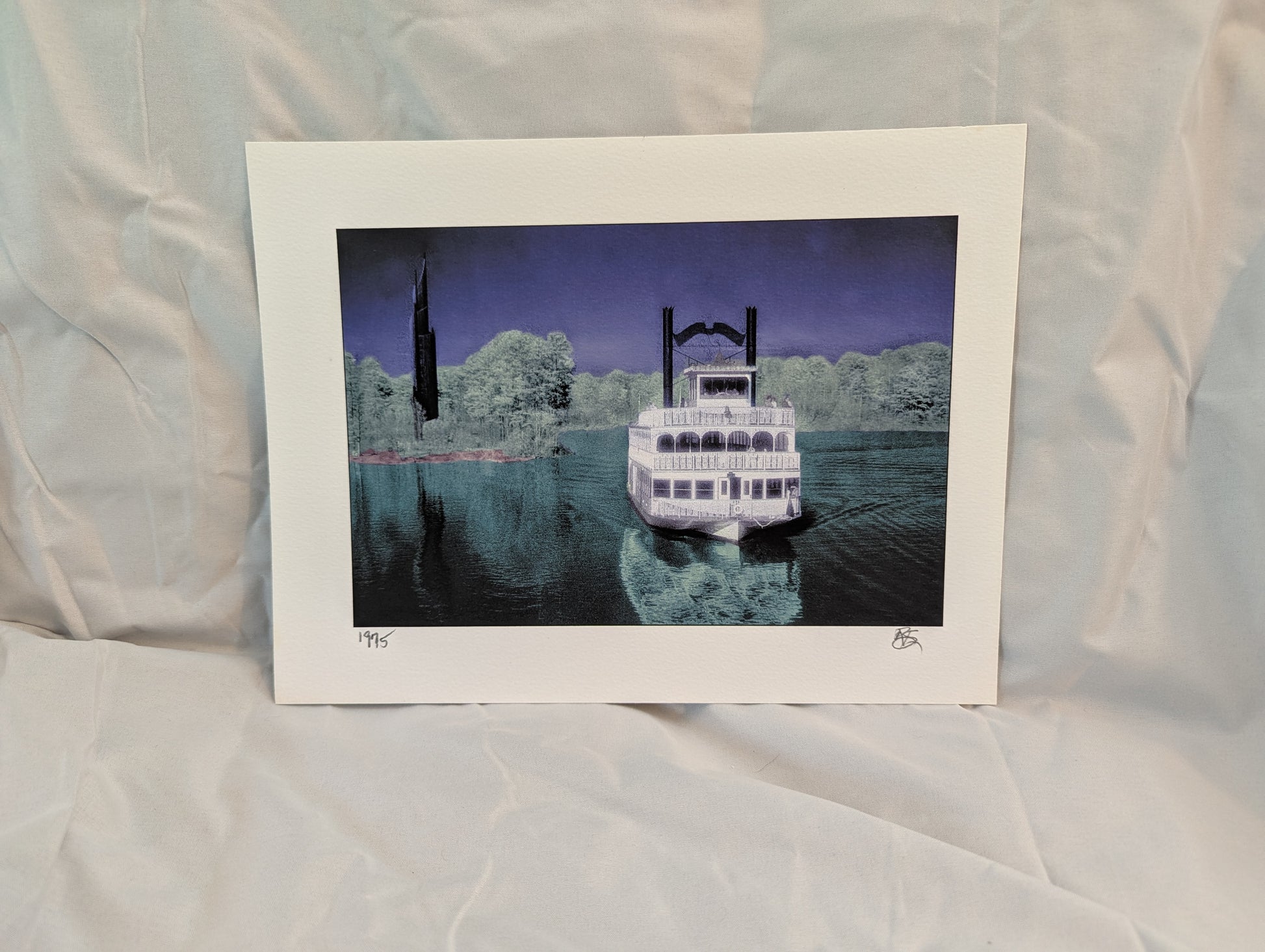 Printed on heavy textured card stock, a bright riverboat makes itsway through the water. Taken, edited, and printed by Roger Sizemore in Atlanta, GA. Signed and dated.